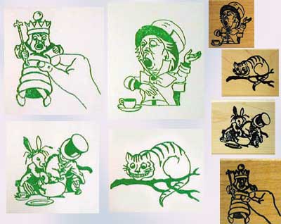 Wonderland Set $22 The Queen is re-issuing her famous Wonderland Stamps. Photo shows the hard wood backs beside stamped images. The Royal Surf has plans to redesign more to keep the Royal Stamp Makers busy. |